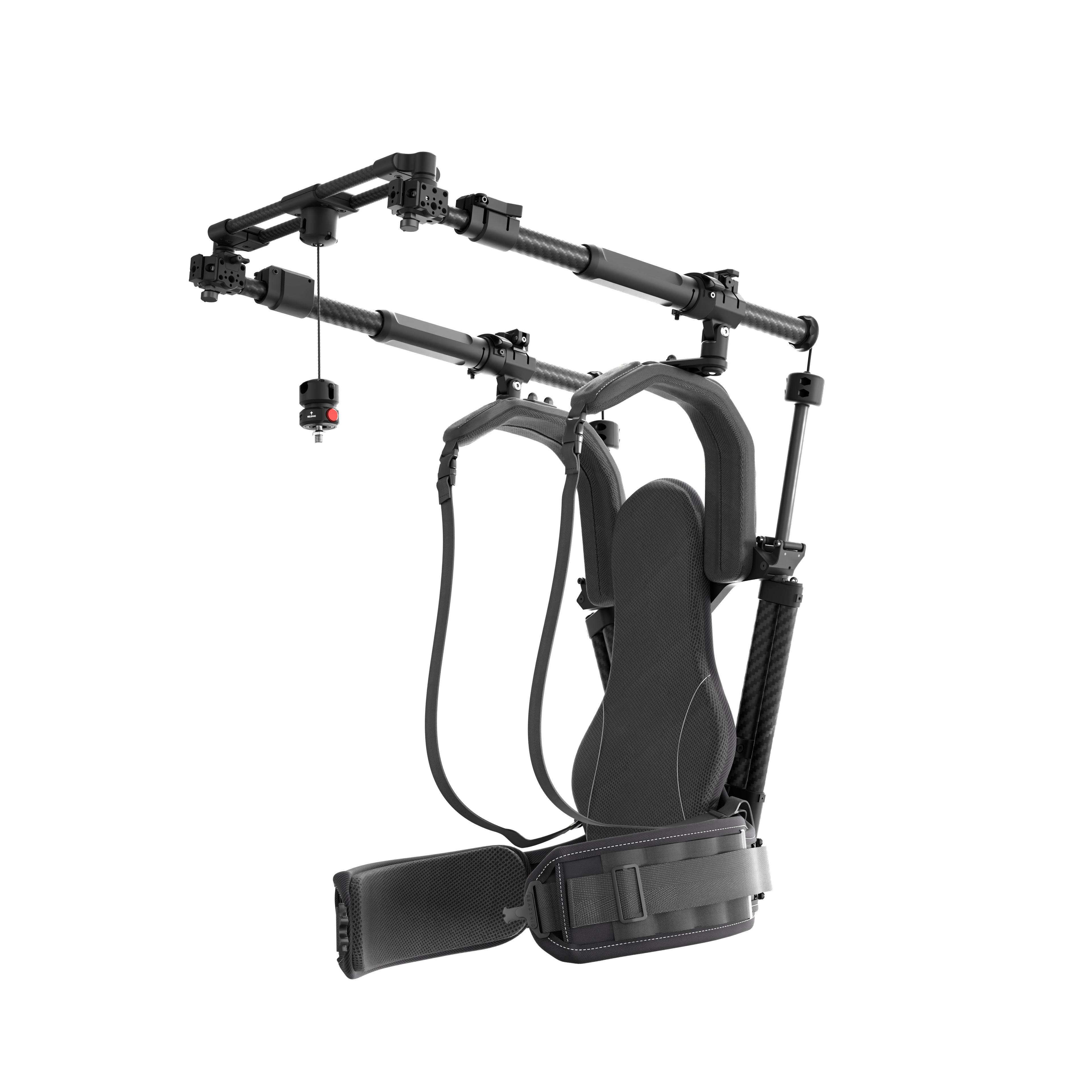 The vest transfers camera weight from your arms and shoulders to your hips and core, supporting loads from 1 to 40 lb. Telescoping carbon fiber arms extend from 23 to 37", providing 55" of vertical boom range and 50" of side-to-side lateral movement.